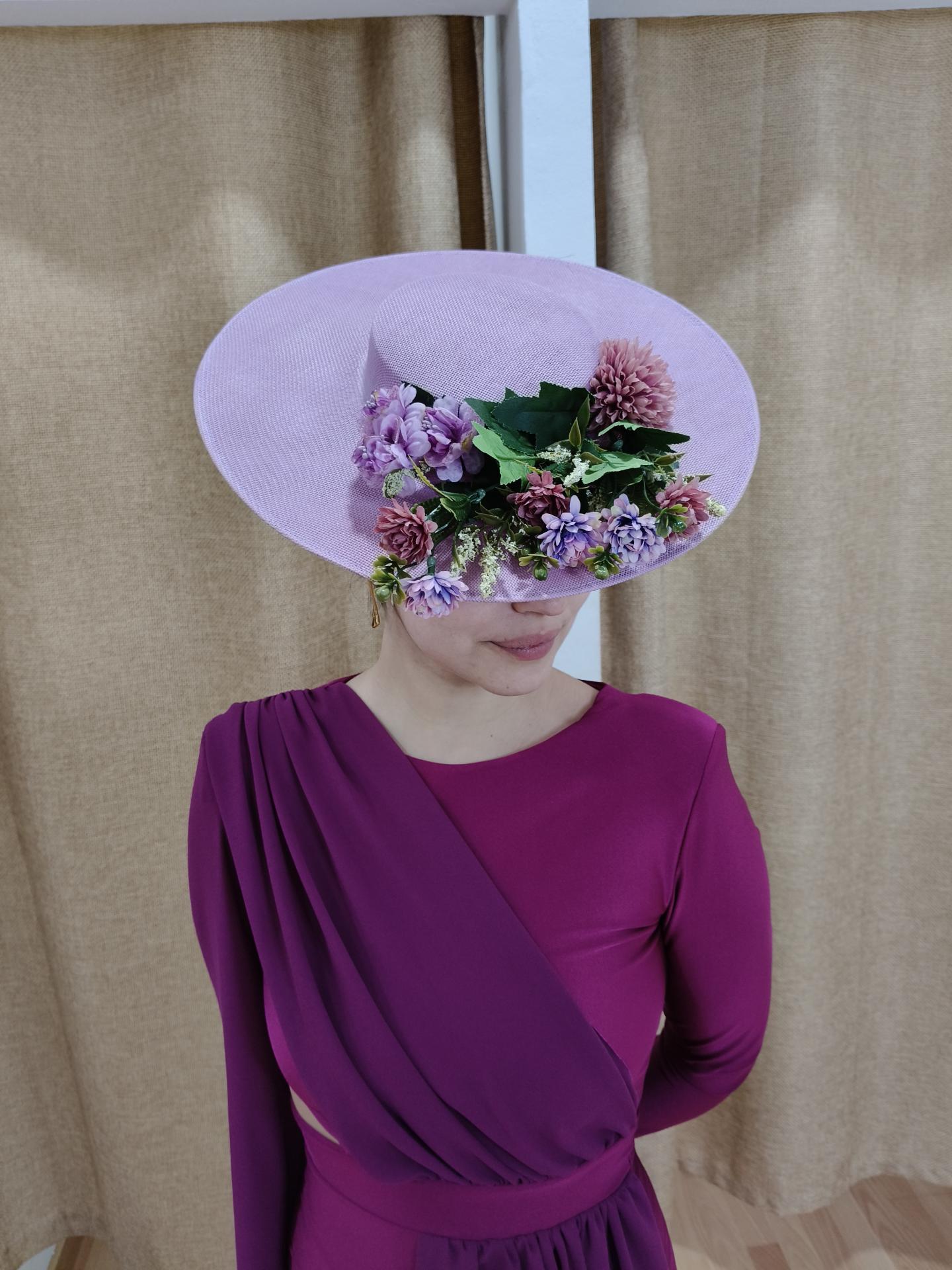 Compuesto: pamela de color lila, con una composicion de flores lila,malva y verde.