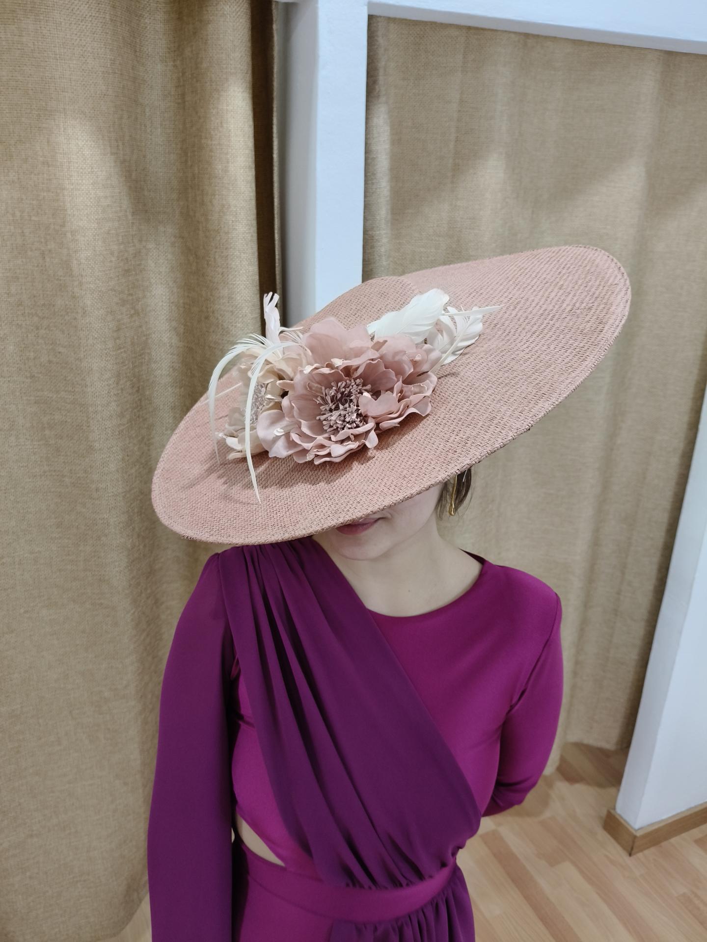 Compuesto: pamela con plumas de faisan, plumas de pato y flores con pistilos rosadas.