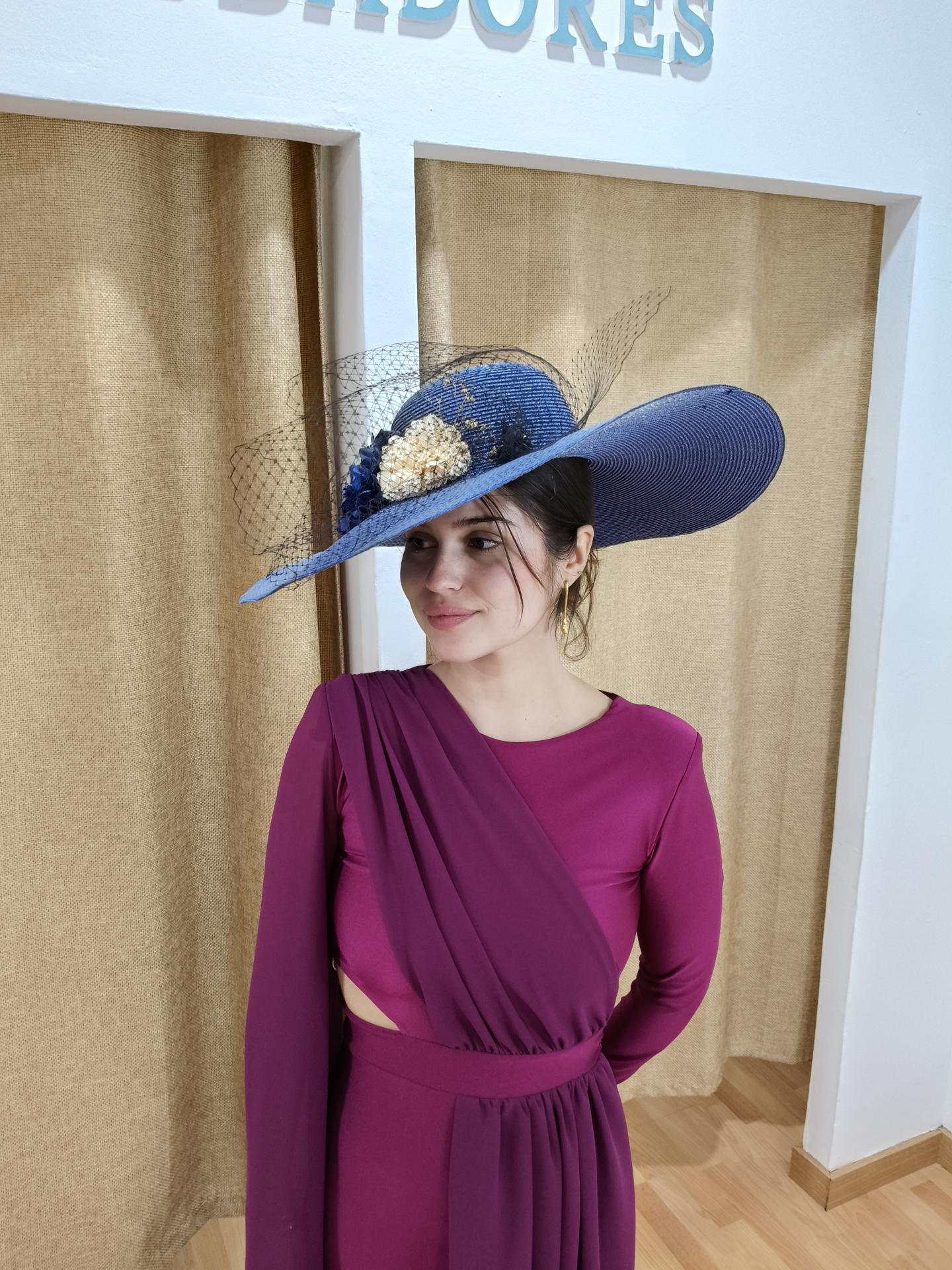 Compuesto: pamela de color azulina, con flores en tonalidad azul noche y beige, paniculata preserada y adorno con redecilla con broche.