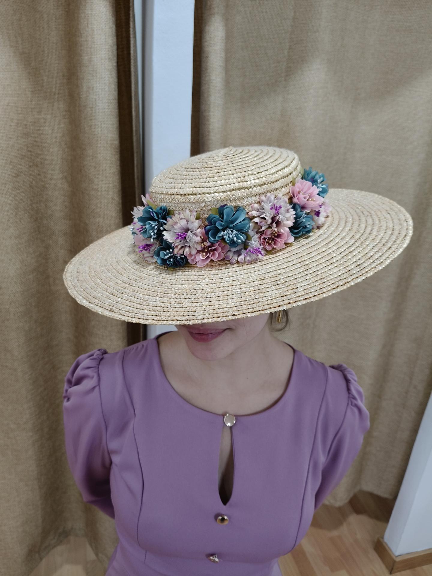 Compuesto: pamela natural de paja con flores alternadas en color rosa palo, verde agua y lila
