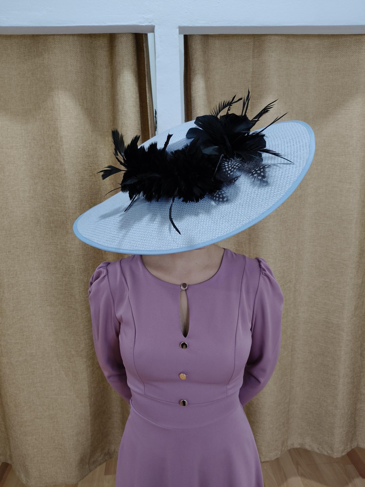 Compuesto: pamela de color celeste, con pomo de plumas de pato negro, plumas grisaceas y negra con flor de plumas negra.