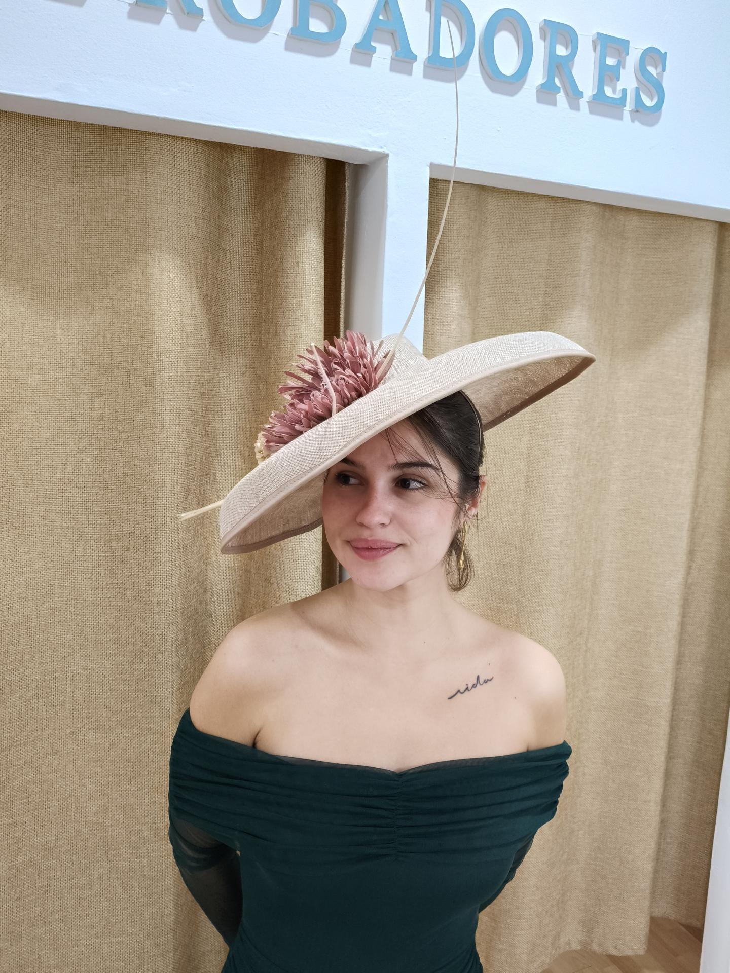 Compuesto: pamela de color beige claro, con flor rosa nude, flores pequeñas beige y raquis de avestruz color hueso.